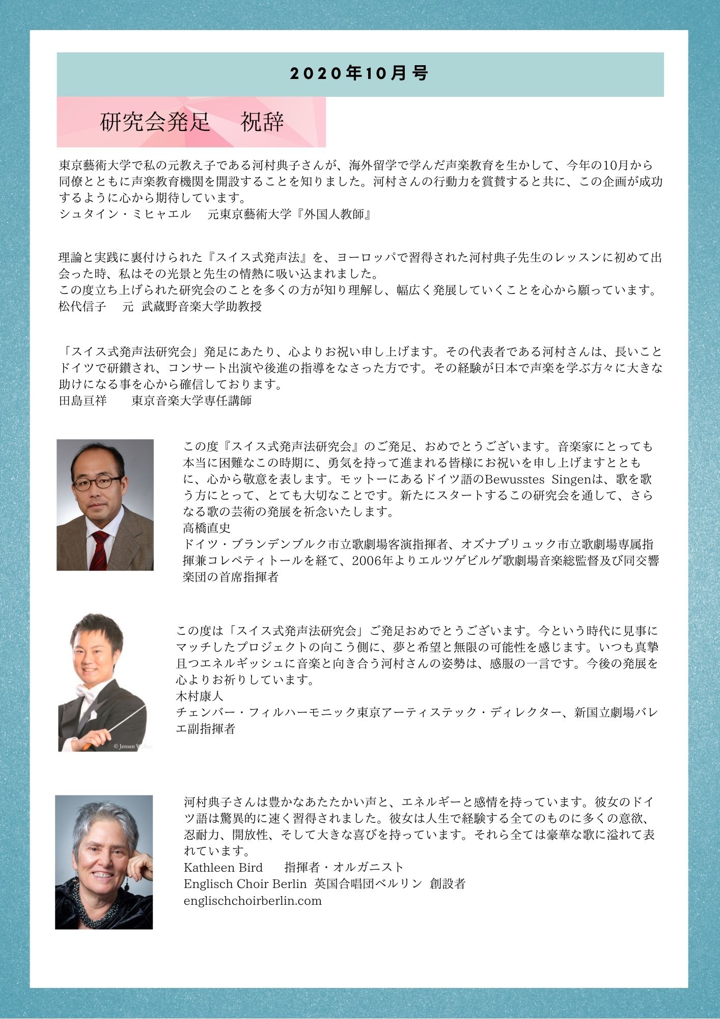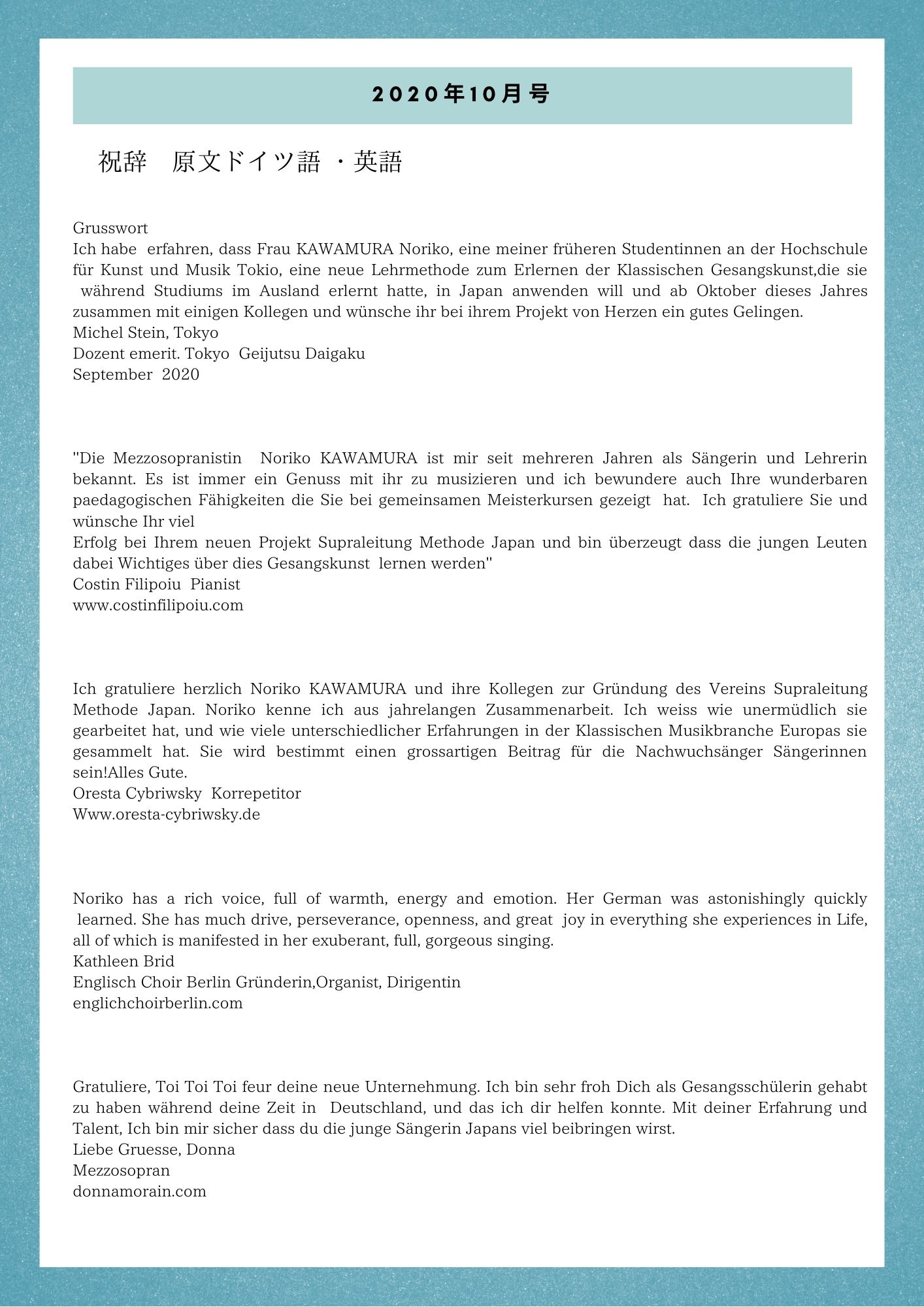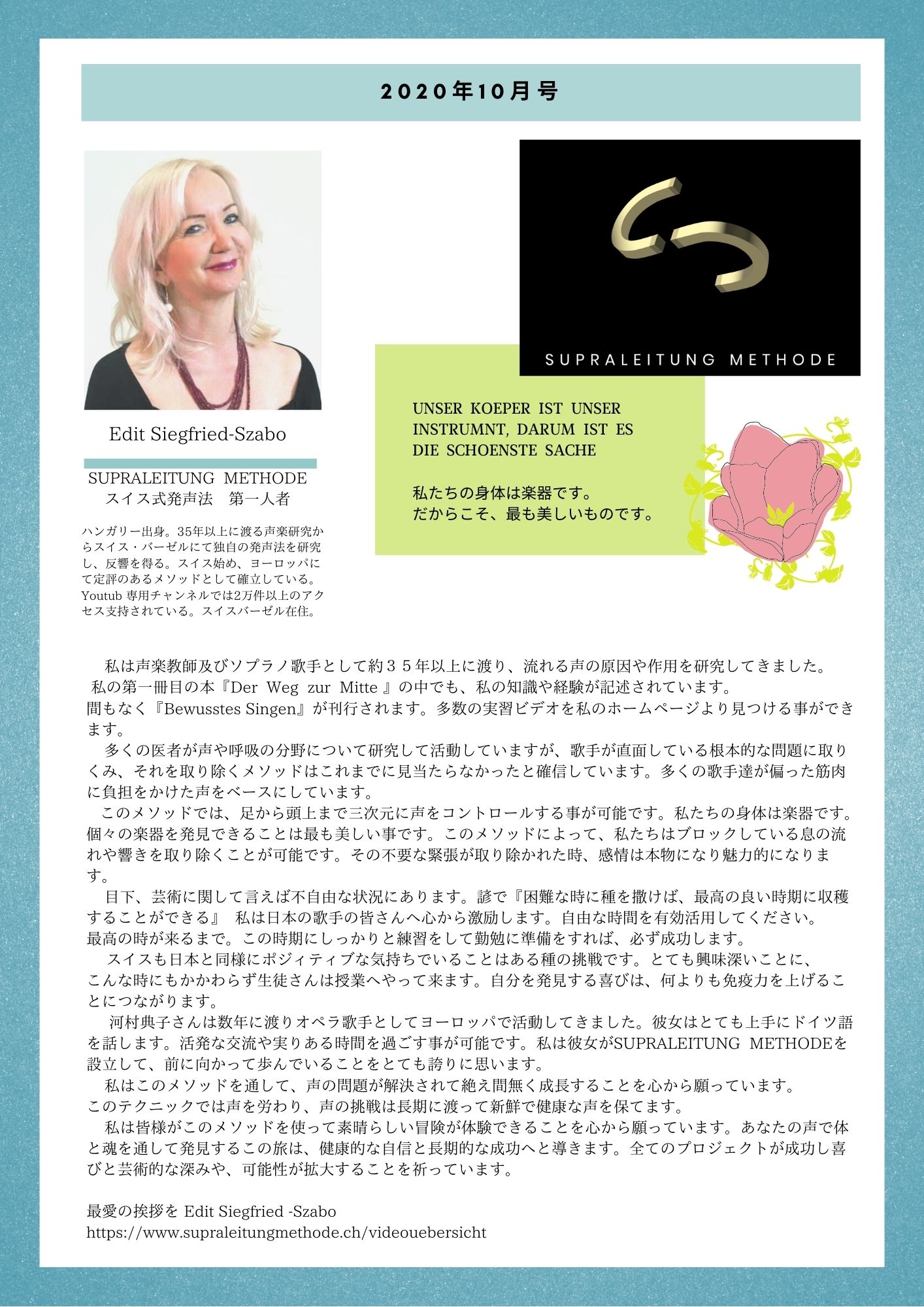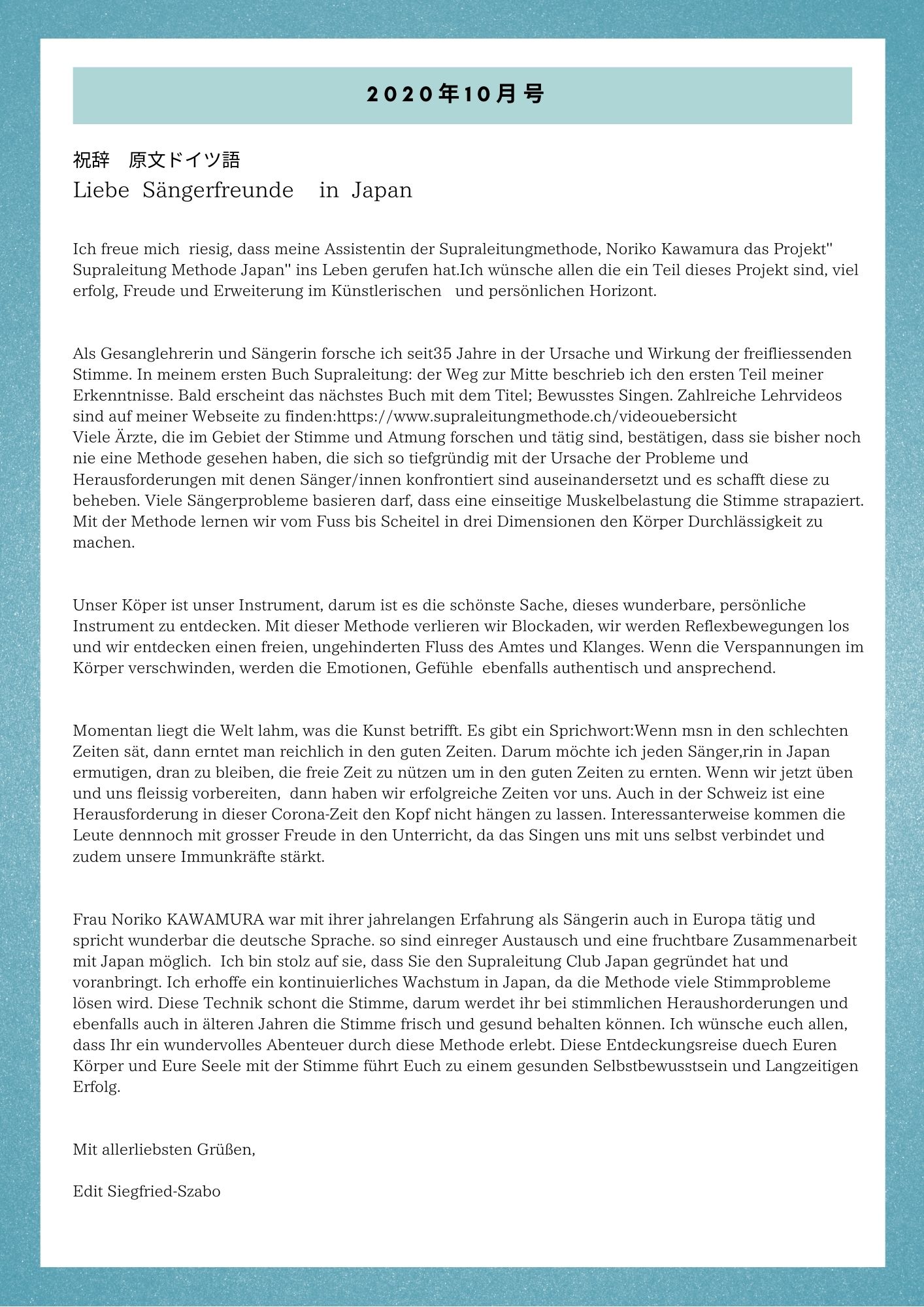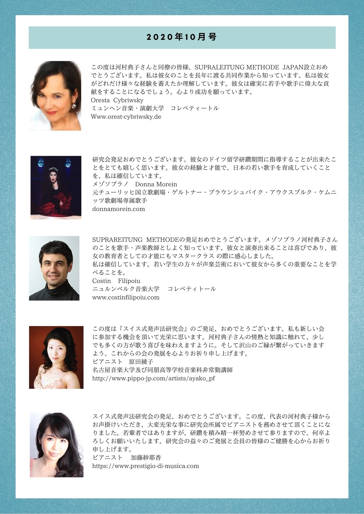 2020年10月1日よりスイス式発声法研究会 Supraleitung Methode Japan始動いたしました。発足に向けて発声法第一人者Edit先生をはじめ著名な音楽家、生徒様、賛助会員の方々から素晴らしい祝辞を頂きました。 Bewusstes Singen (意識・自覚して歌う)、声楽やを声を酷使するご職業の方々にとって、大きな助けになることを確信しています。 ![]() ![]() ![]() ![]() ![]() |