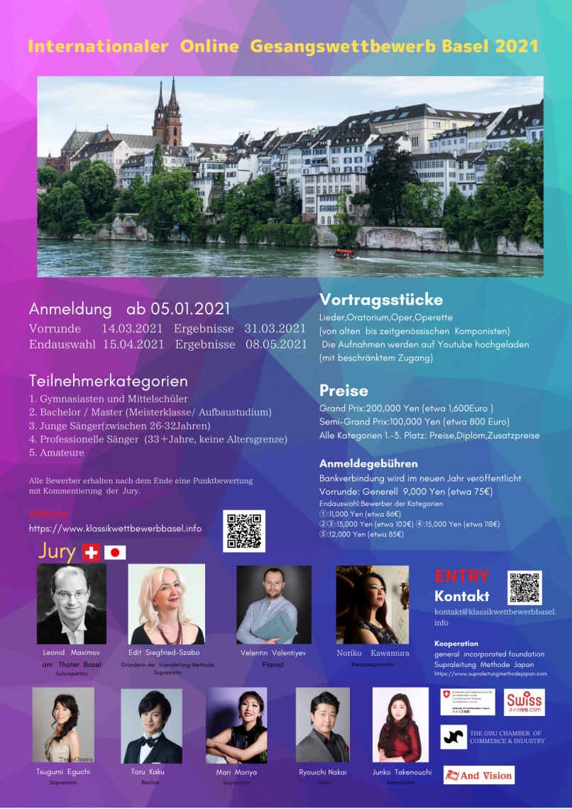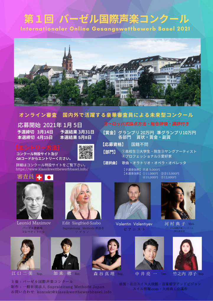 『第1回バーゼル国際声楽コンクール』エントリー締め切りが、2021年3月14日まで延期となりました。まだエントリーを検討されていらっしゃる方も間に合います。 ヨーロッパ形式の総合評価を取り入れましたので、より明確に自分のパフォーマンスを分析することが可能です。審査委員は現役で活躍する日本・スイスの音楽家により構成されています。 声楽演奏において、伴奏ピアニストも大変重要です。 今回副賞に、バーゼル歌劇場のコレペティトールLeonid Maximov賞や、伴奏者賞もございます。また審査員特別賞、優秀賞、リモートアンサンブル賞もございます。 芸術の在り方もこのコロナ禍によって、多様化いたしました。 皆様のエントリーを心よりお待ちしております。 バーゼル国際声楽コンクールHP https://www.klassikwettbewerbbasel.info 問い合わせ先:kontakt@klassikwettbewerbbasel.info ![]() ![]() |