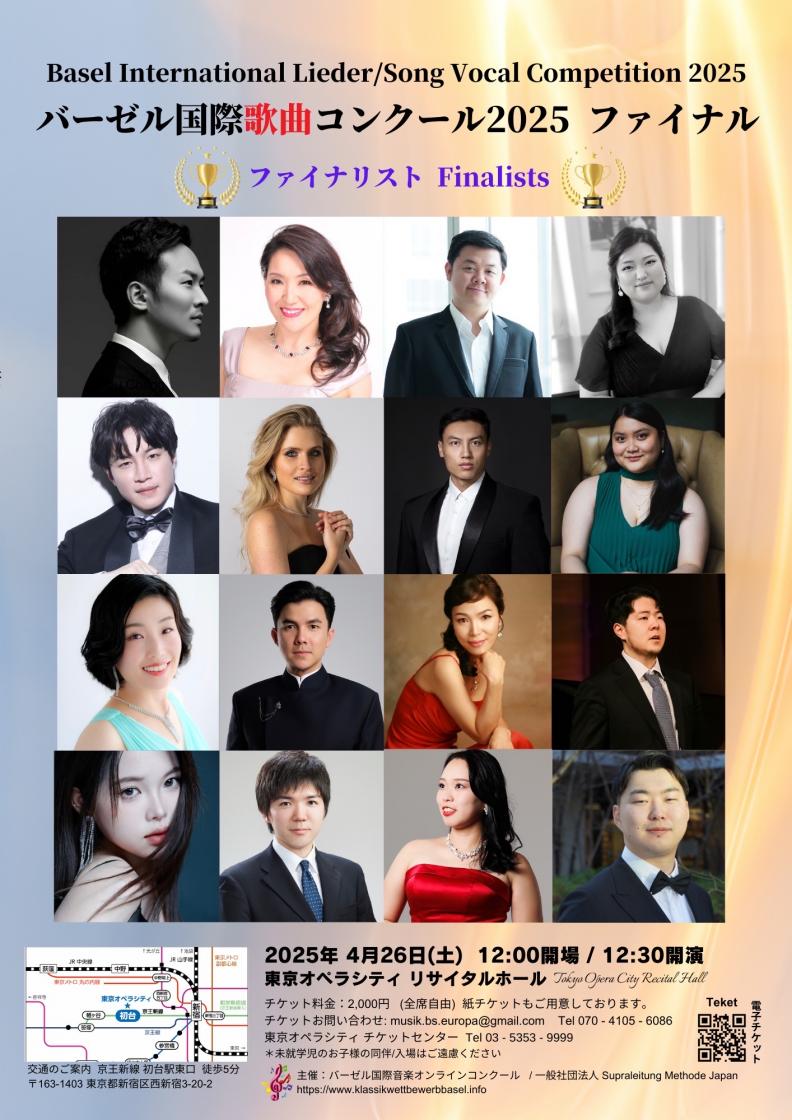 ![]() Basel Internatitonal Lieder/Song Vocal Competition 2025 Final round 4月26日土曜日 午後12時半開演 会場 東京オペラシティ リサイタルホール ️電子チケット いよいよ世界歌曲コンクールファイナル開幕まで二週間となりました。日本にて世界歌曲コンクールが本格的に開催できることを誇りに思っております。 歌曲芸術とはそれぞれの国の文化、言語、歴史の背景を色濃く反映し、詩人の深い精神を体現しています。本コンクールを通じてさまざまな作品に触れ、言葉と音楽が融合することで生まれるエネルギー、インスピレーション、音の響きを大切に演奏していただきたいと願っております。 光栄なことに中国上海音楽学院のピアノ科教授、インドネシアのドイツ歌曲スペシャリスト教授陣もファイナルのために来日してくださいます。 曲目は、バーゼル国際音楽オンラインコンクールの公式ページにて公開いたしました。興味のある方はご覧くださいませ。 何卒よろしくお願い申し上げます。 バーゼル国際歌曲コンクール 2025年4月12日、日本