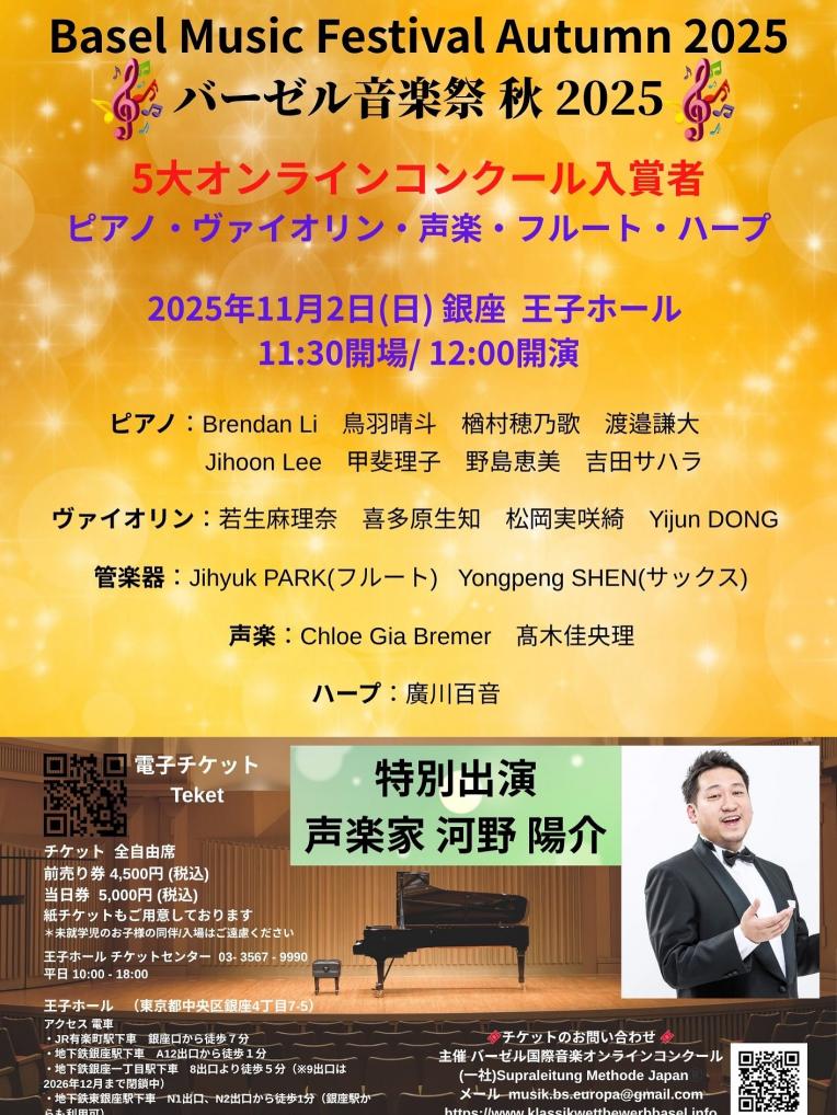 クラシック音楽会・コンサートの集客について 平素よりお世話になっております。 音楽の始まりは、いつもピアノから。 現代の日本社会では、「無料サービス」や「おもてなしの文化」が尊ばれる一方で、昨今の物価高騰や人件費の上昇により、サービス業全体が価格の見直しを迫られる状況にあります。オーバーツーリズムの問題も含め、「無料」での提供を続けることの限界が各所で明らかになりつつあります。 クラシック音楽界も例外ではありません。ピアノ調律の費用、ホールの利用料、出演者の活動費用……あらゆる面でコストが上がる中、「無料」での提供を前提としたコンサート運営には、多くの関係者が頭を抱えています。どこかで決断を下さなければならず、不運にも運営の継続が困難になる団体も出てきているのが現状です。 このような背景から、私たちは日本独特の「過剰サービス」を一度リセットし、有料化について真剣に考えるべき時期に来ていると強く感じています。 仮に参加費をいただいていたとしても、「入場無料」であることがもたらすデメリットの方が、今の時代においてははるかに大きいと考えます。ホールの歴史や立地、出演者のブランド力などを総合的に考慮し、正当な対価として入場料を設定することが、持続可能な文化活動の鍵となるはずです。 しかしながら、これまで「無料」に慣れ親しんできたお客様に、いきなり「有料化」の必要性を伝えても、すぐにはご理解いただけないのが現実です。だからこそ、今から少しずつでも意識を変えていくこと。そして、何よりも「リセットする勇気」を持つことが大切だと考えております。 2025年11月2日(日)、銀座・王子ホールにて開催される「バーゼル音楽祭 秋2025」では、全出演者にチケットノルマは課しておらず、日本を代表する一流ホールである王子ホールにて、誇りを持ってコンサートを開催いたします。 しかし私たちは、出演者や関係者の皆様がこのステージに立つ「価値」を本当に感じてくださっているのか、ここ数日間、自問し続けております。 たとえ一人の出演者がどれだけ努力しても、満席にすることは容易ではありません。ですが、出演者全員が「このコンサートを成功させたい」という強い思いを持つことこそが、観客の心を動かし、会場に足を運ばせるエネルギーとなるのです。 冷静に考えれば、このような名ホールを満席にできるのは、確かに名のある音楽家です。それは誰もが理解していることです。しかし、私たちがなぜこのホールで若き音楽家に演奏の機会を提供しているのか。 出演者の皆様には、このステージに立つことそのものが「ブランド」であるということを胸に、自信を持って、お客様にこの演奏会をご案内していただきたいと願っております。 数日前、一名の出演者がやむを得ない事情で出演できなくなりましたが、急遽、声楽家・河野陽介さんにピンチヒッターとしてご出演いただけることとなりました。 彼には、木下牧子先生作曲の《おんがく》をご披露いただきます。 この一曲を通じて、すべての出演者が心をひとつにし、海外からの入賞者とともに、この音楽祭を最高の時間とすることができますよう、心から願っております。