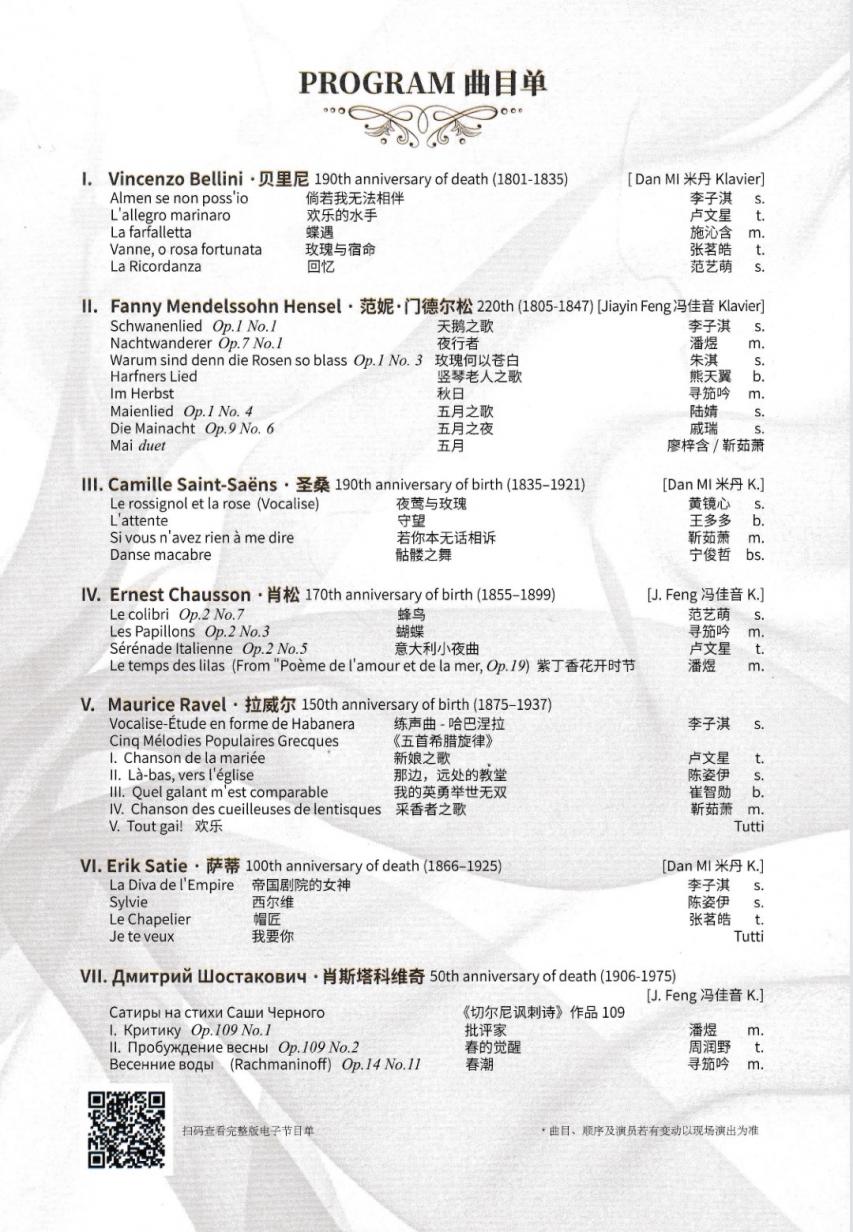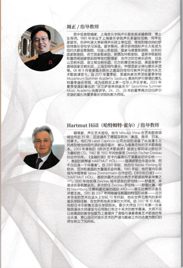 学生の皆さんの印象は、「10代でここまで歌えるのか」と驚かされるほどで、非常に熱心かつ高度な教育が行われていることを強く感じました。Zheng Zhou教授は歌曲専門の教授として大変著名な方であり、ドイツ・カールスルーエ音楽大学学長のハルトムート・ヘル氏とともに、歌曲の夕べを監修されました。日本ではなかなか目にすることのない、意欲的で充実したプログラムであり、芸術歌曲への深い造詣に心から感動いたしました。若さに似合わず、皆さんが知的で品格ある歌を披露されていたことにも、大きな驚きを覚えました。